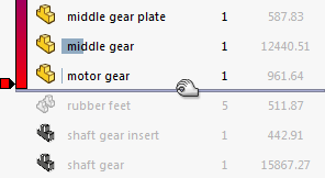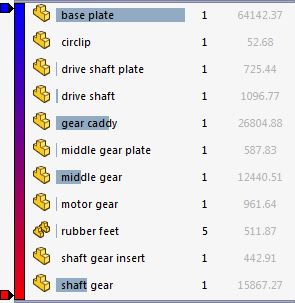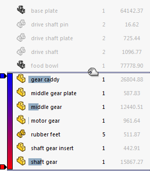 , no painel da Árvore do projeto do FeatureManager, contém uma lista de todos os componentes da montagem, inicialmente classificados por nome de arquivo. Há três colunas: