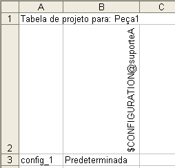Digite os nomes das configurações da peça base nas células do corpo da tabela. Por exemplo, para usar a configuração predeterminada de uma peça base chamada arruela.sldprt, a sintaxe do cabeçalho da coluna é: $CONFIGURAÇÃO@arruela. O valor da célula do corpo da tabela é Predeterminada.