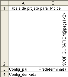 Veja a seguir um exemplo de tabela de projeto que controla uma configuração de um componente. Como a célula do corpo da tabela de Config_derivada foi deixada em branco, a configuração de componente utilizada é vinculada a Config_pai, que é a configuração Predeterminada.