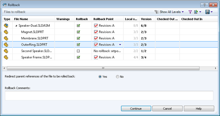 SOLIDWORKS PDM 尝试将子文件与修订版、过渡或触发父文件的退回检入文件相匹配。 父文件退回点的任何更改将重新计算树中子文件的默认退回点。