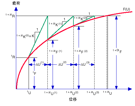 由于内部节点力 t+Δt{F} 取决于 t+Δt 时刻的节点位移 t+Δt{U},因此必须使用迭代方法。下列方程式代表以某个时间阶梯 t+Δt 求解平衡方程式的迭代方案基本思路: