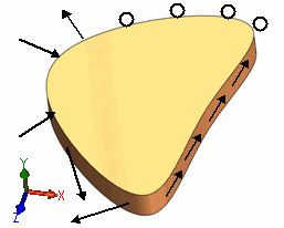 图中显示承受平面内张力、压缩及抗剪力的薄板。Y 中的模型尺寸与 X 和 Z 尺寸相比较要小很多。对于该范例,您平行于 XZ 基准面选取一截面,指定厚度,并给边线应用载荷和夹具。