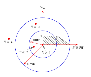 部分相关取决于两个节之间的空间距离 Rij。根据用户定义的参数 RMIN、RMAX 和 Rij 之间的关系: