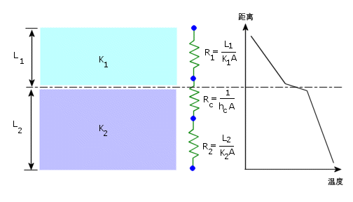 通过两个接触面之间的界面,存在两种模式的传热。第一种是通过固体到固体接触的点的传导传热(Q传导),这种传热非常有效。第二种是通过填充间隙的空气的传导传热(Q间隙),由于空气的热导率较低,这种传热可能很弱。为了论述热接触阻力,在两边具有传导介质的一组物体中加上界面传导率 hc,如下图所示。