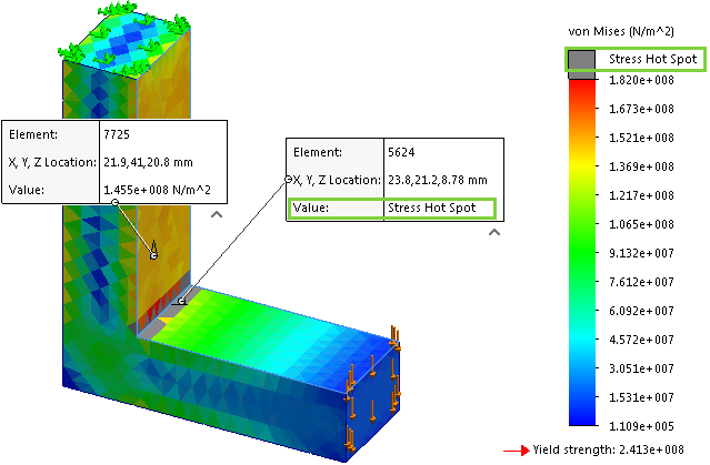 检测到应力热点并以灰色高亮显示。 单元上的已探测注解将为值显示应力热点字符串。 |
