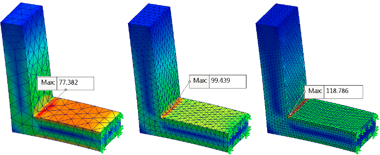 应力奇异性的特性行为是应力值和网格细化(局部使用网格控制或通过全局编辑网格)一起保持增长,理论上正发散到无限。 如果应力热点元素处的应力不随网格细化增长并朝有限值收敛,那么表明它们应力集中(“合理”的高应力区域)。