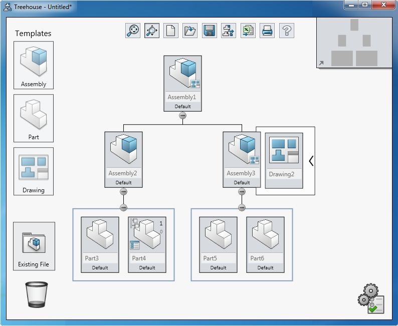 在 SOLIDWORKS 中开始建造模型前,您可以利用 Treehouse 在图形用户界面设置您的 SOLIDWORKS 装配体层次结构。 您还可以利用 Treehouse 添加到现有文件结构。