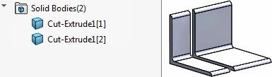 在零件文件中的實體數目會顯示在實體旁邊的括弧中。如果好幾個本體是從同一個特徵產生而來,副本數出現在列於實體中的每個副本後的方括弧中。例如,下列的零件包含由一個伸長除料所產生的兩個實體: