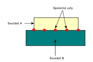 Program spojí entity Sada 1 a Sada 2 (zdrojovou a cílovou) definované v PropertyManager Kontaktní sada. Spojené entity se chovají jako svařované. Tato volba je dostupná u statických, nelineárních, frekvenčních a teplotních studií a studií zborcení. Síť nemusí být kompatibilní. Pokud je síť kompatibilní, program sloučí stejnolehlé uzly podél rozhraní, v opačném případě použije vnitřně rovnice omezení a simuluje tak spojení.