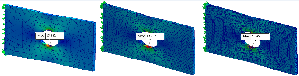 Konvergující napětí v blízkosti díry při zjemnění sítě indikují koncentrace napětí. |