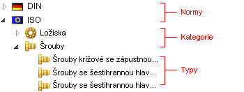 Strom Normy Toolbox v levém podokně uvádí kromě uživatelských složek a součástí, které definujete, také normy, kategorie a typy.