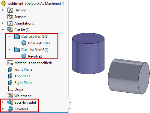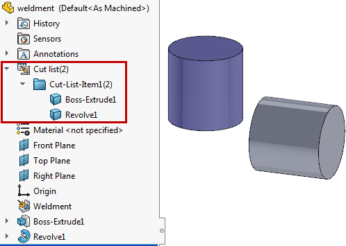 V tomto modelu mají těla Extrude1 (Vysunutí 1) a Revolve1 (Otočení 1) stejný objem, ale zobrazují se v samostatných složkách Cut-List-Item (Položka tabulky přířezů)