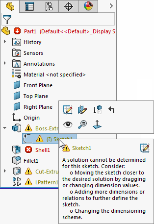 Informace o chybách s výzvou k nápravným akcím se zobrazují ve stromu FeatureManager, drobečkové navigaci a grafické ploše. Již nemusíte otevírat dialog Informace o chybách.