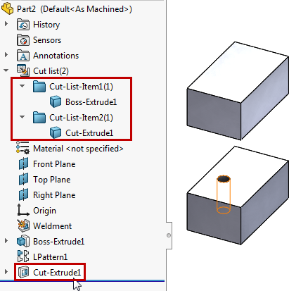In questo modello, il corpo Ripetizione a L1 è stato creato da Estrusione-Estrusione1, quindi Taglio-Estrusione1 è stato aggiunto a un'istanza di ripetizione. Si intende escludere la geometria di funzione Taglio-Estrusione1 dall'ordinamento della distinta di taglio.