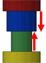 表側(Near Side)の最後の要素(青)は、ブラインド(Blind)に設定されます。 裏側(Far Side)の最初の要素(緑)は、次要素まで(Up To Next Element)に設定されます。 緑の要素の深さは、黄色の要素の端から青い要素に合うまでで定義され、方向は矢印で表示されます。 緑の要素の深さは、黄色の要素と青の要素と接触するように調整されます。 |