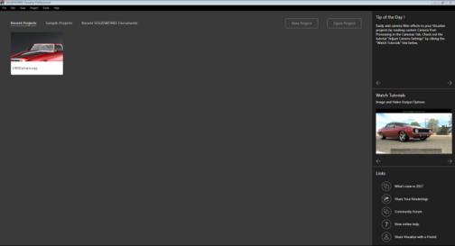 Você pode visualizar miniaturas de projetos do SOLIDWORKS Visualize (*.SVPJ) e do Bunkspeed (*.BIF) recentemente abertos, abrir os projetos com um clique, "fixar" projetos para que eles sempre apareçam na tela inicial antes dos projetos não fixados e exibir a pasta em que cada arquivo de projeto está armazenado no Windows Explorer.