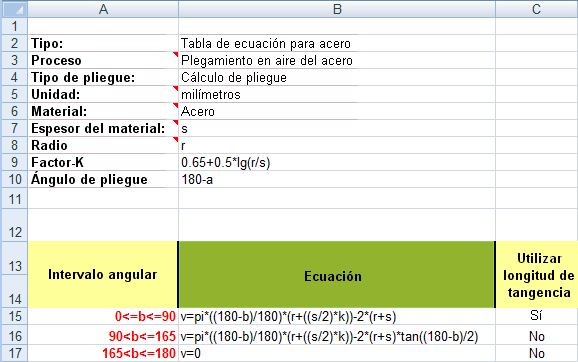 Con las tablas de cálculo de pliegue, puede definir diferentes intervalos angulares, asignar ecuaciones a dichos intervalos y calcular la longitud desarrollada de la pieza.