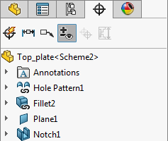 Se puede alternar entre el gestor de diseño del FeatureManager, el PropertyManager, el ConfigurationManager, el DimXpertManager y el DisplayManager haciendo clic en las pestañas de la parte superior del panel izquierdo de la ventana de SOLIDWORKS.