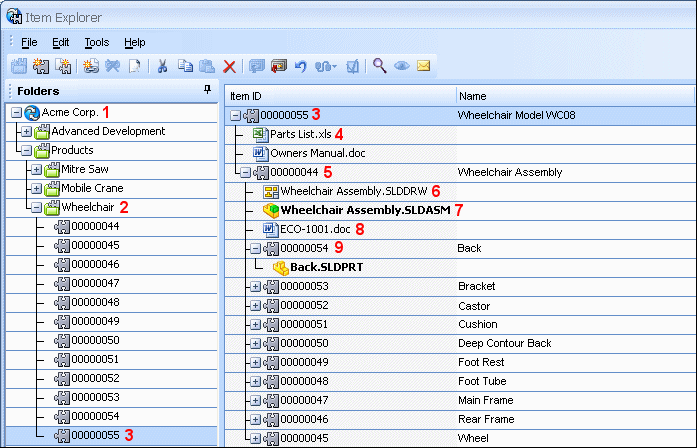 - 00000055 is the top-level item for the wheelchair product. Selecting an item in the navigation pane displays the item structure in the main pane.