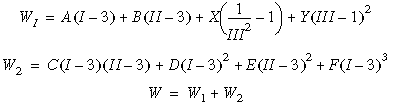 Burada I, II ve III, sağ Cauchy-Green deformasyon tensörünün değişmezleridir ve ana uzama oranları açısından ifade edilebilir. A, B, C, D, E ve F, Mooney malzeme sabitleridir ve