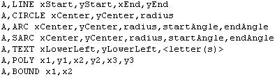 "A" harfiyle başlayan satırlar, bir sembolün geometrik şeklinin bir kısmını tanımlar. Sembollerde genellikle bu satırlardan birden fazla bulunur.
