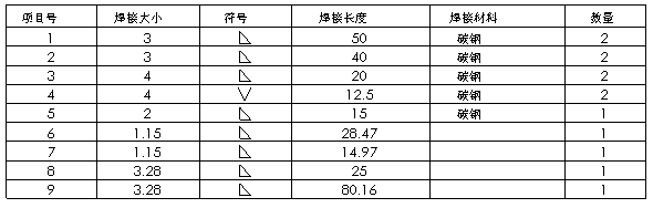 在焊接表中组合相同的焊接类型 您可在焊接表中组合相同的焊接类型。此表格可汇总焊接长度、焊接质量和各项的数量。 在焊接表中组合相同的焊接类型: 单击表格左上角的 移动表格图标,选择焊接表。 在焊接表 PropertyManager 中的选项下,选择组合相同的焊接类型。 单击 。 当焊缝数据发生更改时,焊接表也会更新。 在本范例中,执行焊接类型组合后,行 1 和 2、行 6 和 7 以及行 8 和 9 将组合在一起。行 3 和 4 不会组合在一起,因为它们属于不同的焊接类型。例如,当行 1 和 2 组合后,焊接长度为 180 (2x50 + 2x40),数量为 1。 未组合(焊缝按类型、大小和长度进行分组。) 已组合(焊缝按类型和大小进行分组。) 父主题焊接表 相关任务 插入焊接表 在焊接表中添加列 在焊接表中修改列 编辑焊接表 在焊接表中添加工程图符号 保存焊接表 相关参考 焊接表 PropertyManager