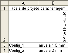 Em uma tabela de projeto, o parâmetro $PARTNUMBER permite especificar um valor diferente para a coluna Nº DE PEÇA da BOM. Em um documento de montagem, este é o número de peça usado quando a configuração aparece na BOM como uma submontagem. O cabeçalho da coluna usa esta sintaxe:
