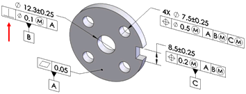 Показанная в примере схема нанесения размеров создана с помощью инструмента "Схема автонанесения размера" и базы A , выбранной в качестве первичной базы, базы B, выбранной в качестве вторичной базы, а также базы C, выбранной в качестве третичной базы. Используется позиционный допуск в базе C относительно баз A и B.
