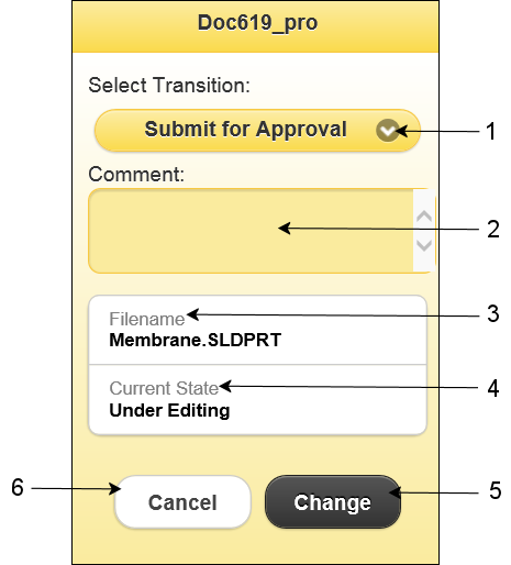 變更狀態畫面 在行動版中,您可以轉換單一檔案,但無法同時轉換多個檔案。 若要開啟變更狀態畫面,請按一下在檔案詳細資料視圖畫面上狀態旁的按鈕。 變更狀態畫面 1 選擇轉換 為所選的檔案選擇許可的轉換。 2 備註 讓您輸入轉換評論。 3 檔案名稱 顯示要轉換的檔案名稱。 4 目前狀態 顯示所選檔案的目前狀態。 5 變更 在檔案詳細資料視圖中變更檔案狀態並更新狀態。 6 Cancel 取消轉換動作並顯示檔案詳細資料視圖。 上層主題行動版本使用者介面