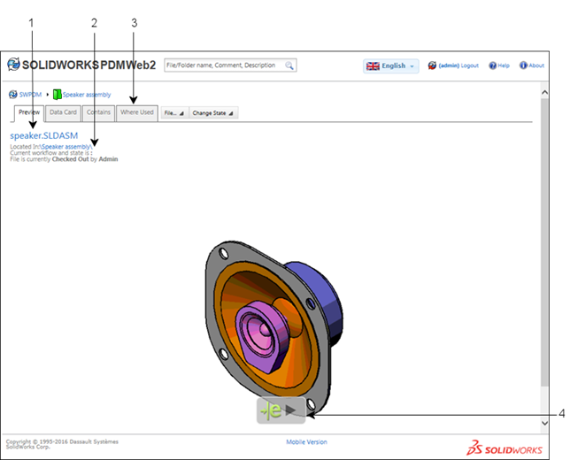 預覽頁面會顯示 SOLIDWORKS 檔案的點陣圖,而且可讓您使用 WebGL 檢視器啟動互動式預覽。 其他一般檔案類型會轉換為看起來與該檔案類型之原始應用程式相似的 HTML 預覽。