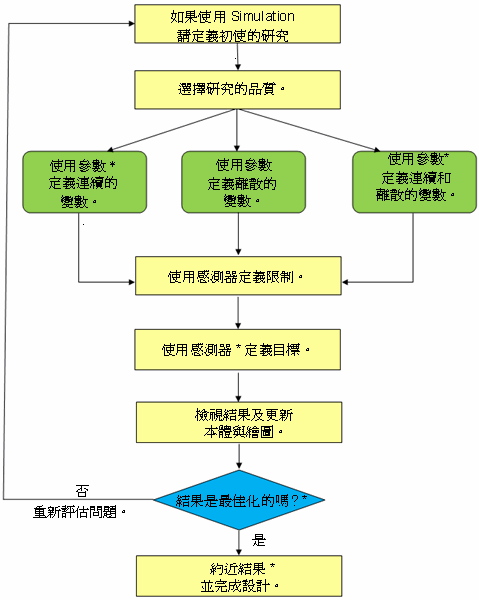 執行設計研究的工作流程 本節將介紹設定與執行設計研究的基本操作。 工作流程圖表 在流程圖表中,標示 * 即表示僅適用於最佳化設計研究。 定義初始的 Simulation 研究 在設計研究中使用模擬資料感測器時,您會產生至少一個初始研究。 初始研究代表最佳化或評估程序的基礎。 在每個迭代過程中,程式都會依照修改後的變數執行這些研究。 評估初始研究的結果 如果在設計研究中使用模擬研究,評估初始研究的結果將有助您定義設計研究問題。 尤其當您要將研究當做限制使用時,此舉對於數量的檢查將十分有用</Z1>。</Z2> 設定設計研究的屬性 定義變數 定義限制 您可以透過定義限制為設計指定必須滿足的條件。 限制可以是驅動的整體變數或質量屬性、尺寸、及模擬資料的感測器。 定義目標 您可以透過定義目標,為最佳化設計研究指定您的目標函數。 (在 SOLIDWORKS Standard 與 SOLIDWORKS Professional 中不可用。) 檢視設計研究的結果 您可以透過結果視圖標籤來查看所執行研究的結果。 設計研究的結果 下列表格總結了不同研究品質與變數組合的預期結果。 上層主題設計研究 下一個主題 設計最佳化