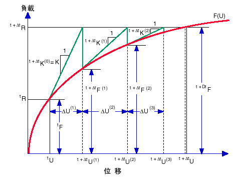 在本演算法中,在特定步階期間的每個迭代中,都會組合和分解切線勁度矩陣,如下圖所示。NR 法的收斂速度較高,為二次收斂速度。但是,由於切線勁度會在每個迭代中組合與分解,所以對於大模型而言十分昂貴,此時最好改用另一個迭代法。