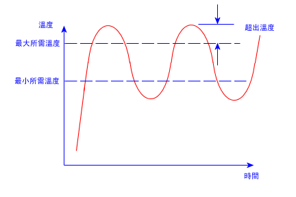 如果恆溫器正常運作,則在充分的求解時間內,於恆溫器位置上的溫度與時間關係圖應如下圖所示呈上下波動。如果界限的其中一邊或兩邊的超出溫度大,需以較小的時間步階來修改專題屬性,並重新執行專題。