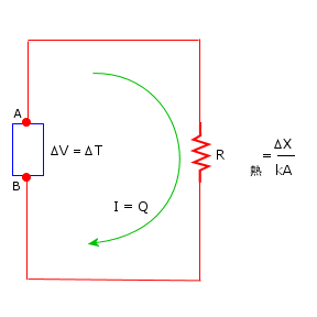 實體的熱傳導與電導體中的導電性在許多方面上都很相似。在導體中,電流是由電位差推動,而熱流則是由溫差推動。在電流傳導中,電流是透過電子運動,從導體的一點傳送到另一點,而在熱傳導中,熱是透過實體分子在能量增加下振動,從實體的一點傳送到另一點。
