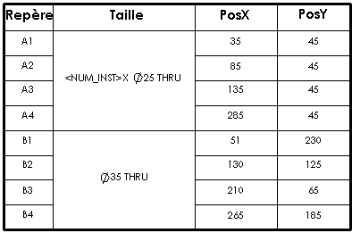Mise à jour automatique de la table de perçages Sélectionnez pour mettre à jour la table des perçages quand vous ajoutez ou supprimez des composants dans l'assemblage associé.