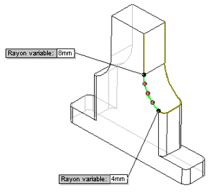 Vous pouvez manipuler les points de contrôle entre les sommets d'un congé à taille variable symétrique et asymétrique et leur affecter des valeurs de rayon.