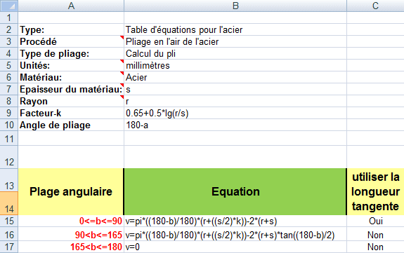 Les tables de calcul du pli permettent de définir diverses tranches angulaires, d'affecter des équations à ces tranches et de calculer la longueur développée de la pièce.