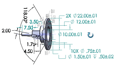 Lorsque vous activez Vues d'annotations dynamiques, vous ne voyez que les vues d'annotations qui sont pertinentes à l'orientation actuelle du modèle. Pendant que vous faites pivoter le modèle, les vues d'annotations qui ne sont pas normales à l'orientation du modèle disparaissent, alors que des annotations apparaissent lorsqu'elles s'approchent de la normale.