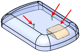 Werkzeug-Volumenkörper zur Einbuchtung eines Ziel-Oberflächenkörpers Oberflächen-Zielkörper und drei für Werkzeugkörper-Bereich ausgewählte Volumenkörper (rote Pfeile) Vorschau Ergebnis der Einbuchtung Verdickte Oberfläche Übergeordnetes ThemaBeispiele für Einbuchtungs-Features Zugehörige Konzepte Beispiel für Einbuchtung – Bohrerverpackung Beispiel für Einbuchtung - Verpackung mehrerer Teile Werkzeug-Volumenkörper zur Einbuchtung eines Ziel-Volumenkörpers Werkzeug-Oberflächenkörper zur Einbuchtung eines Ziel-Volumenkörpers