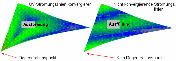 Ein von zwei oder mehreren Profilen gemeinsam verwendeter Eckpunkt wird als degenerierter Punkt bezeichnet. Die UV-Linien konvergieren in einem einzelnen Punkt. Ein degenerierter Punkt kann zu nachfolgenden Problemen führen, wenn Sie einen Offset oder eine Wandung der Fläche erstellen oder einen Radius auf die Flächenkante anwenden.