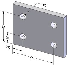 もとのフィーチャーからパターンで配置されたフィーチャーの公差タイプと値を設定します。 2 つのフィーチャーでは、原点にもっとも近いフィーチャーをどのように使用して、パターンを配置したか注意をしてください。