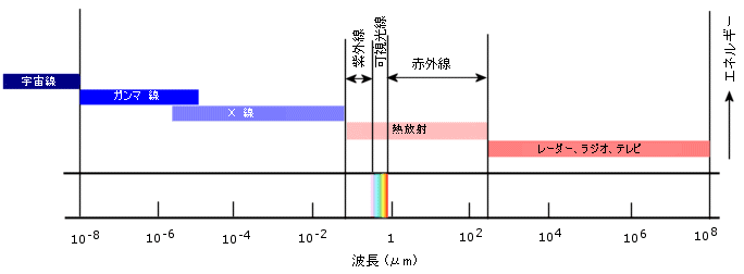 ふく射 熱輻射は、温度が原因で、電磁波の形をとって物体から熱エネルギーが放出される現象です。 絶対零度以上の温度を持つ物体は、熱エネルギーを放出します。 電磁波は真空中を伝播するため、輻射するための媒体を必要としません。 下の図は、熱輻射以外の手段(X 線、y 線、宇宙線など)で放出された放射と比較した熱輻射の範囲を波長で示したものです。 太陽のエネルギーは輻射によって地球へ伝えられます。 電磁波は光の速度で伝播するため、最も高速な熱伝達メカニズムです。 目次 輻射の基本定義 ステファン ボルツマンの法則 プランク分布(Planck Distribution) 実表面からの輻射放出 表面の放射熱交換(面-面輻射)(Radiation Exchange Between Surfaces (Surface to Surface Radiation)) シェルサーフェスからの輻射(Radiation from Shell Surfaces) 輻射形態係数 親トピック熱伝達の仕組み 関連概念 伝導 対流(Convection)