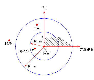 部分相関は2つの節点間の空間距離 Rij に依存します。ユーザー定義パラメータ RMIN、RMAX、Rij の間の関連によって、次のようになります:
