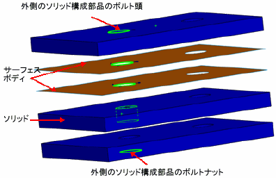 は 2 つ、または複数のコンポーネント、または、コンポーネントとグランドを結合することができます。 ボルトは、混在する重なったソリッド、シェル、板金ボディを貫通して定義することができます。 同じ構成部品のエンティティを選択することにより、ボルトを定義することもできます。