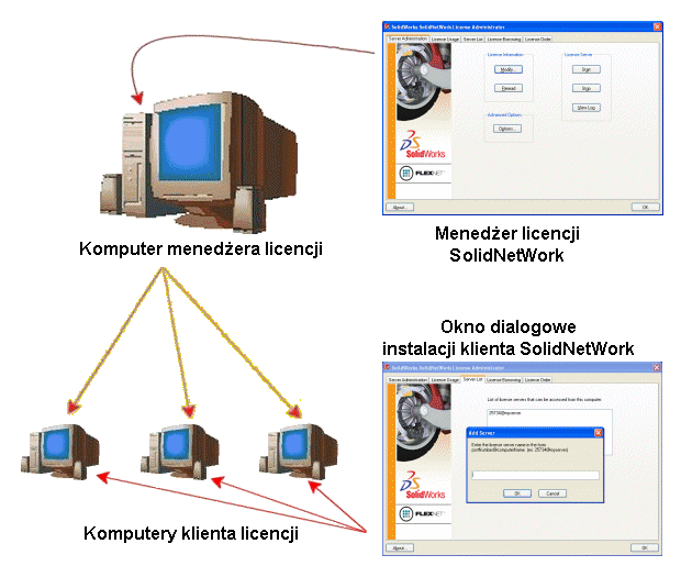 Obraz ten przedstawia typową instalację licencjonowania SolidNetWork: