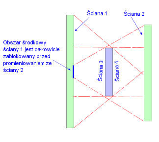 Promieniowanie pomiędzy dwoma ścianami elementów może zostać zablokowane przez ścianę trzeciego elementu. W takim przypadku współczynnik konfiguracji przybiera wartość 0. Oprogramowanie automatycznie uwzględnia blokowanie pomiędzy wszystkimi określonymi ścianami, zgodnie z ilustracją. Aby prawidłowo uwzględnić blokowanie, konieczne jest wybranie ścian uczestniczących w promieniowaniu. Ściany 3 i 4 w poniższym przykładzie częściowo blokują promieniowanie pomiędzy ścianami 1 i 2. Jeżeli wybrane zostaną tylko ściany 1, 2 i 3, otrzymane wyniki będą nieprawidłowe.