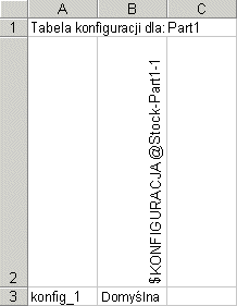 W komórkach głównej części tabeli należy wprowadzić nazwy konfiguracji części bazy. Na przykład, aby użyć domyślną konfigurację części bazy dla operacji podziału nazwanej Część1-1.sldprt, składnia nagłówka kolumny będzie następująca: $KONFIGURACJA@Część1-1. Wartość komórki tabeli jest Domyślna.