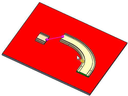 W menedżerze właściwości PropertyManager, w obszarze Otwarte dokumenty, wybrać zakrzywiony tor i przeciągnąć wskaźnik z dołączonym torem do obszaru graficznego, jak pokazano na ilustracji, ale go nie zwalniać. Podczas przeciągania zakrzywionego toru w kierunku prostego toru należy zwrócić uwagę na linię przyciągania wiązania magnetycznego, która pojawi się w trakcie przeciągania bliżej toru zakrzywionego.