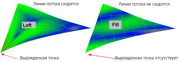 Вершина, общая для двух или более профилей, называется вырожденной точкой. Поток на внутренней поверхности (УФ-линии) сходится в одной точке. Вырожденная точка может вызвать проблемы в последствии при смещении грани или удалении с нее оболочки или при применении радиуса к кромке этой грани.