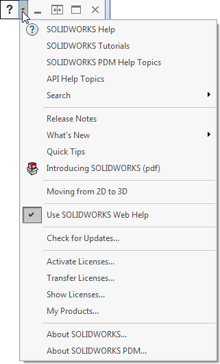 В строке меню содержатся наиболее часто используемые кнопки инструментов из панели инструментов "Стандартная", меню SOLIDWORKS, поиска SOLIDWORKS и всплывающего меню параметров справки.